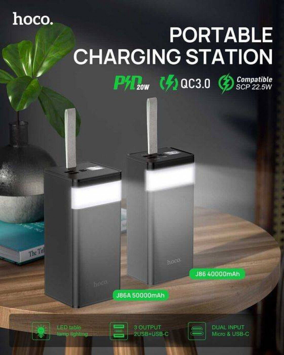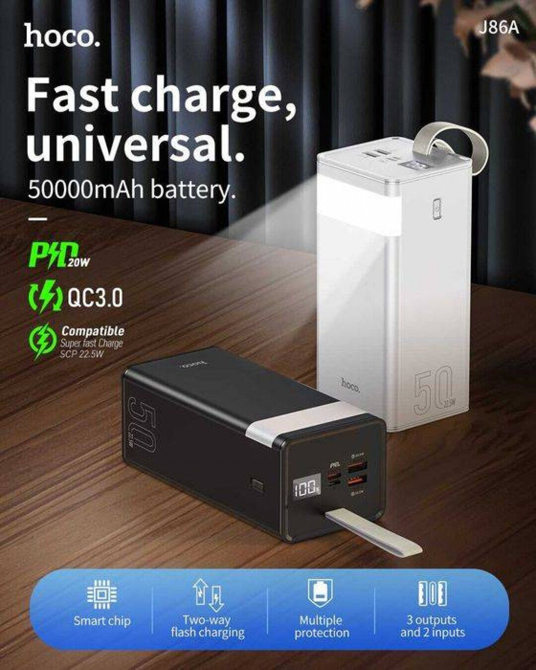 Hoco J86A Powermaster — це потужний зовнішній акумулятор із вражаючою ємністю 50 000 мА·год, створений для тих, хто завжди в русі і не хоче залишатися без зв’язку. Він легко підзарядить твій смартфон, планшет, а навіть ноутбук кілька разів поспіль, тож ти завжди залишатимешся на зв’язку та готовим до роботи чи розваг.